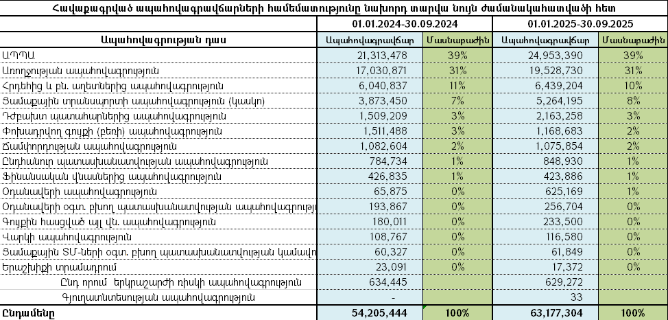 Ներկայացնում ենք ապահովագրական շուկայի կուտակային ապահովագրավճարների համեմատությունը նախորդ տարվա նույն ժամանակահատվածի հետ (2025թ․ և 2024թ․).