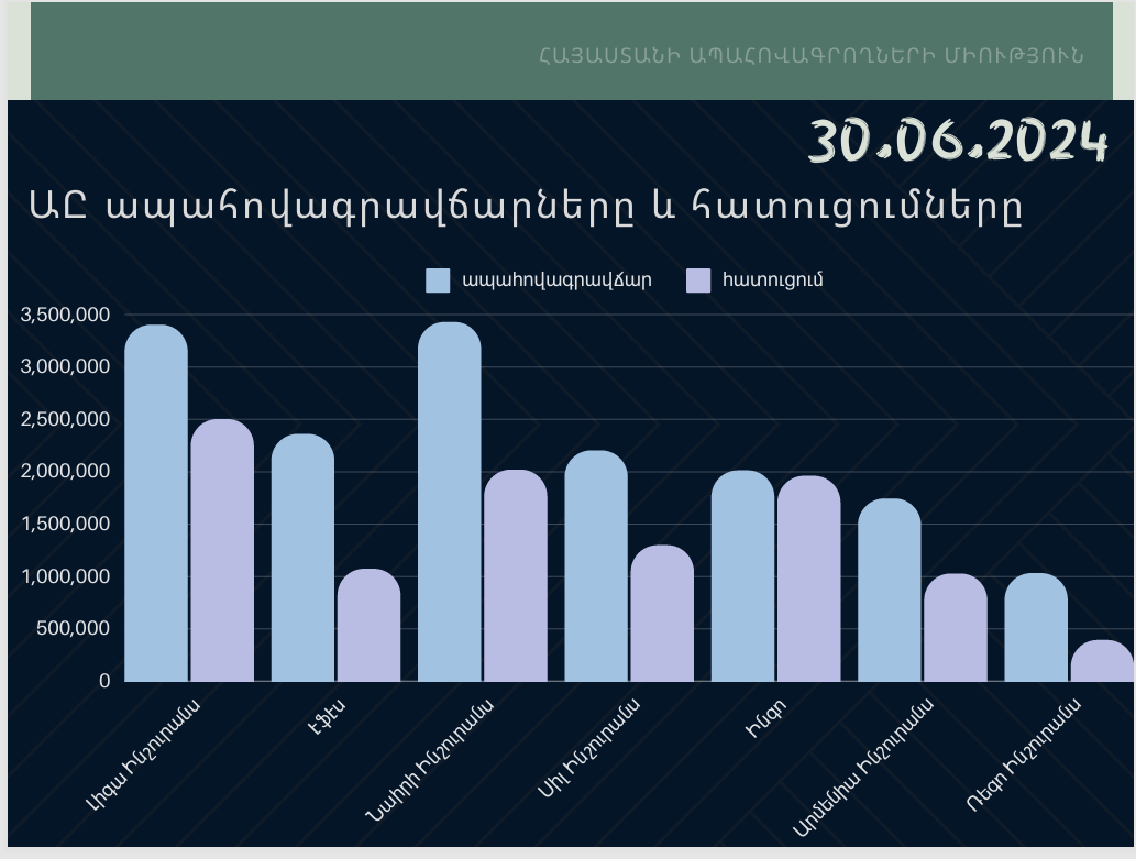 Ներկայացնում ենք Հայաստանում գործող ապահովագրական 7 ընկերությունների հավաքագրած ապահովագրավճարներն ու վճարած հատուցումները 30․06․2024թ․ դրությամբ․