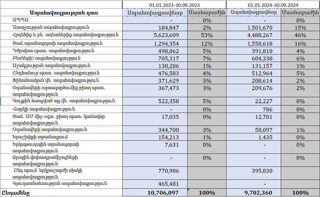 Ներկայացնում ենք ապահովագրական շուկայի՝ ըստ դասերի կուտակային վերաապահովագրավճարների համեմատությունը 2024թ․ երրորդ եռամսյակի համար (2024 և 2023թթ․)․